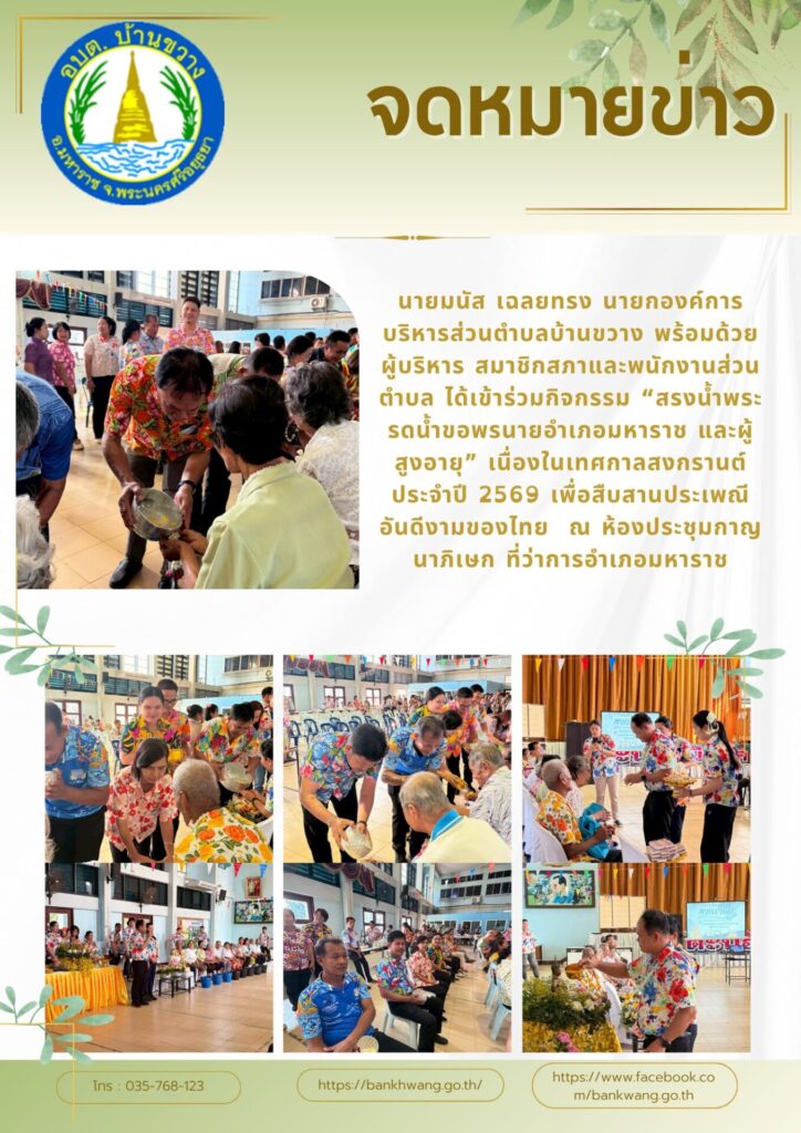 นายมนัส เฉลยทรง นายกองค์การบริหารส่วนตำบลบ้านขวาง พร้อมด้วย ผู้บริหาร สมาชิกสภาและพนักงานส่วนตำบล ได้เข้าร่วมกิจกรรม “สรงน้ำพระ รดน้ำขอพรนายอำเภอมหาราช และผู้สูงอายุ” เนื่องในเทศกาลสงกรานต์ ประจำปี 2569 เพื่อสืบสานประเพณีอันดีงามของไทย ณ ห้องประชุมกาญนาภิเษก ที่ว่าการอำเภอมหาราช