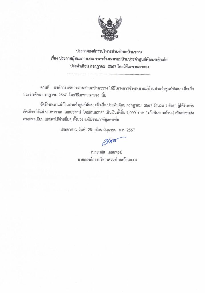 ประกาศองค์การบริหารส่วนตำบลบ้านขวาง เรื่อง ประกาศผู้ชนะการเสนอราคาจ้างเหมาแม่บ้านประจำศูนย์พัฒนาเด็กเล็ก ประจำเดือน สิงหาคม 2567 โดยวิธีเฉพาะเจาะจง Post published:28 มิถุนายน 2024 Post category:ข่าวจัดซื้อจัดจ้าง