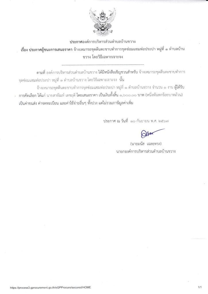 ประกาศองค์การบริหารส่วนตำบลบ้านขวาง เรื่อง ประกาศผู้ชนะการเสนอราคา จ้างเหมารถขุดตีนตะขาบทำการขุดซ่อมแซมท่อประปา หมู่ที่ ๑ ตำบลบ้านขวาง โดยวิธีเฉพาะเจาะจง