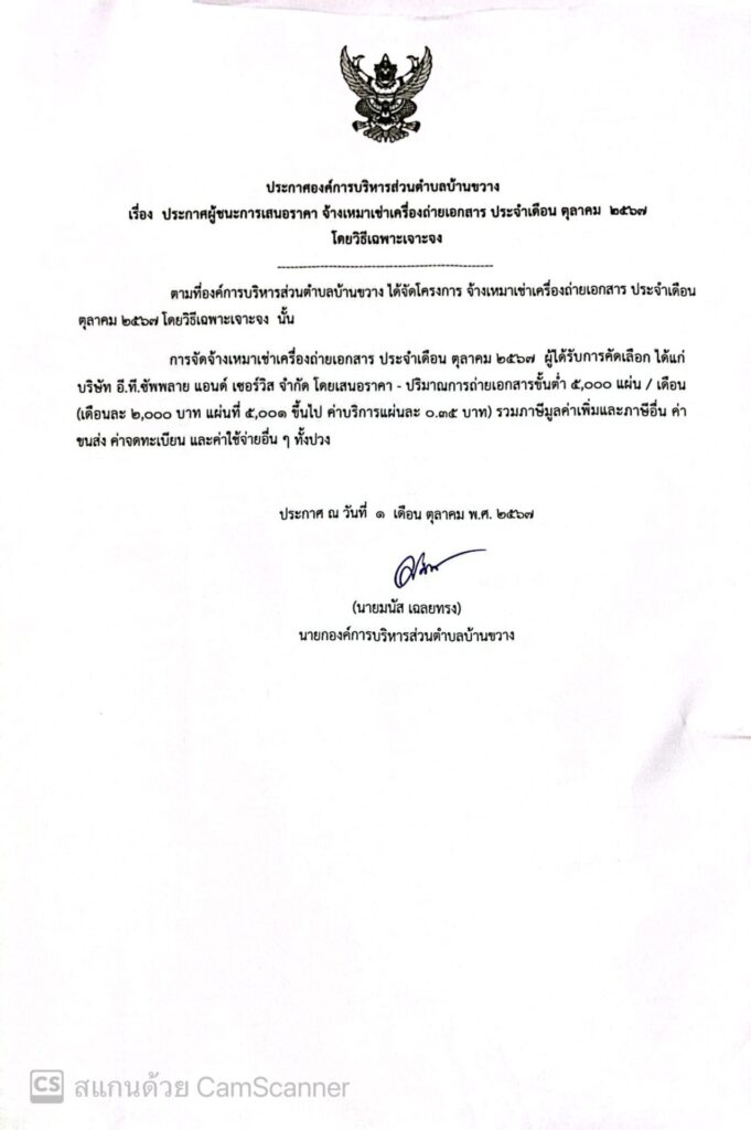 ประกาศองค์การบริหารส่วนตำบลบ้านขวาง เรื่อง ประกาศผู้ชนะการเสนอราคา จ้างเหมาเช่าเครื่องถ่ายเอกสาร ประจำเดือน ตุลาคม 2567 โดยวิธีเฉพาะเจาะจง Post published:1 ตุลาคม 2024 Post category:ข่าวจัดซื้อจัดจ้าง