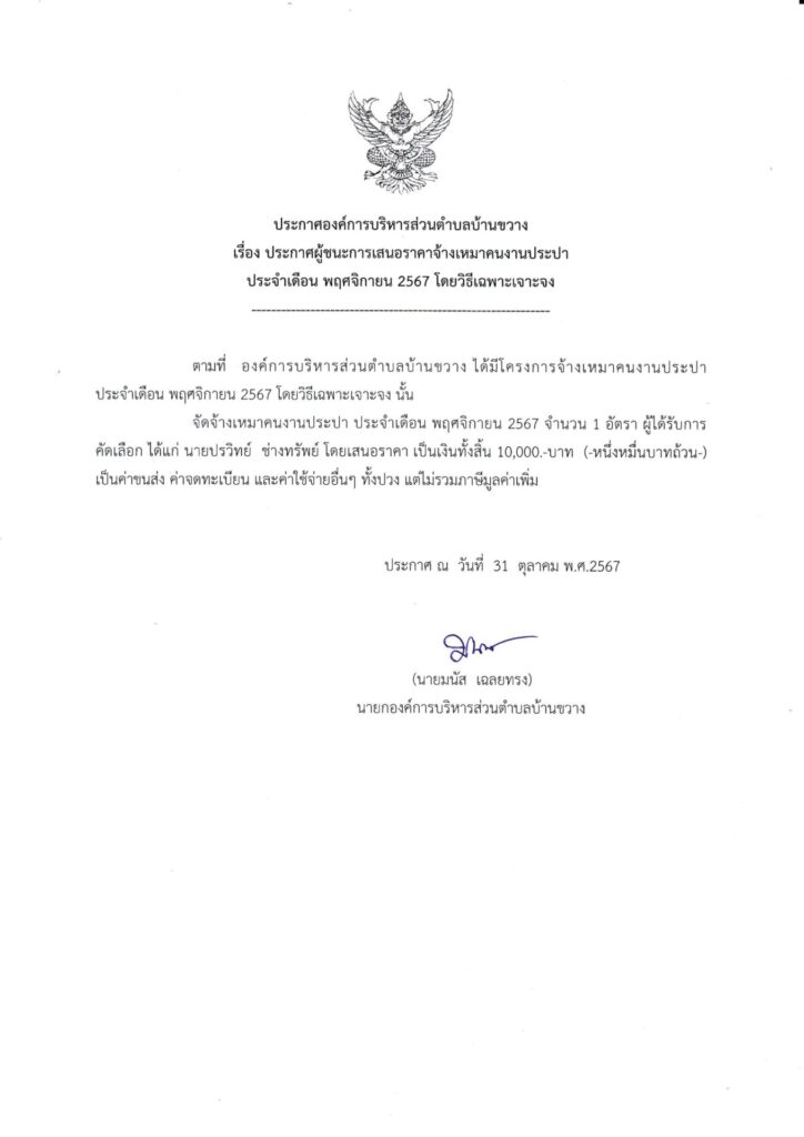 ประกาศองค์การบริหารส่วนตำบลบ้านขวาง เรื่อง ประกาศผู้ชนะการเสนอราคาจ้างเหมาคนงานประปา ประจำเดือน พฤศจิกายน ๒๕๖๗ โดยวิธีเฉพาะเจาะจง
