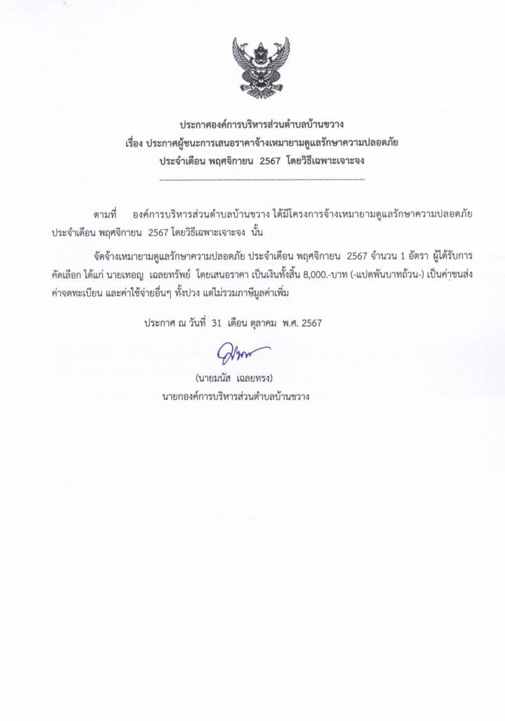 ประกาศองค์การบริหารส่วนตำบลบ้านขวาง เรื่อง ประกาศผู้ชนะการเสนอราคาจ้างเหมายามดูแลรักษาความปลอดภัย ประจำเดือน  พฤศจิกายน  2567 โดยวิธีเฉพาะเจาะจง