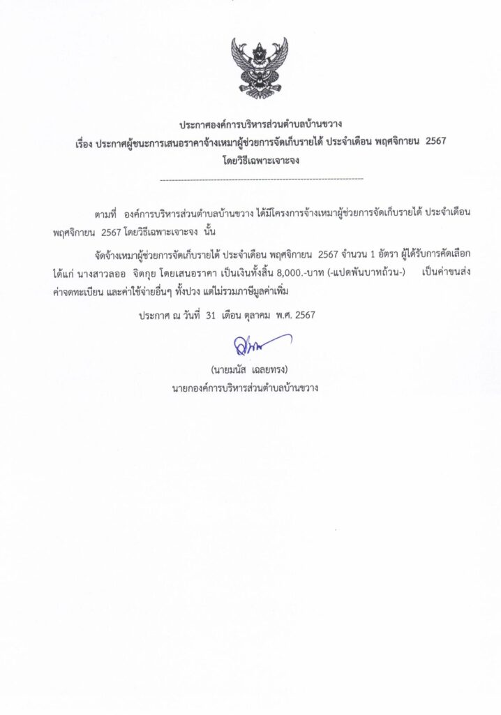 ประกาศองค์การบริหารส่วนตำบลบ้านขวาง เรื่อง ประกาศผู้ชนะการเสนอราคาจ้างเหมาผู้ช่วยการจัดเก็บรายได้ ประจำเดือน พฤศจิกายน 2567 โดยวิธีเฉพาะเจาะจง Post published:31 ตุลาคม 2024 Post category:ข่าวจัดซื้อจัดจ้าง