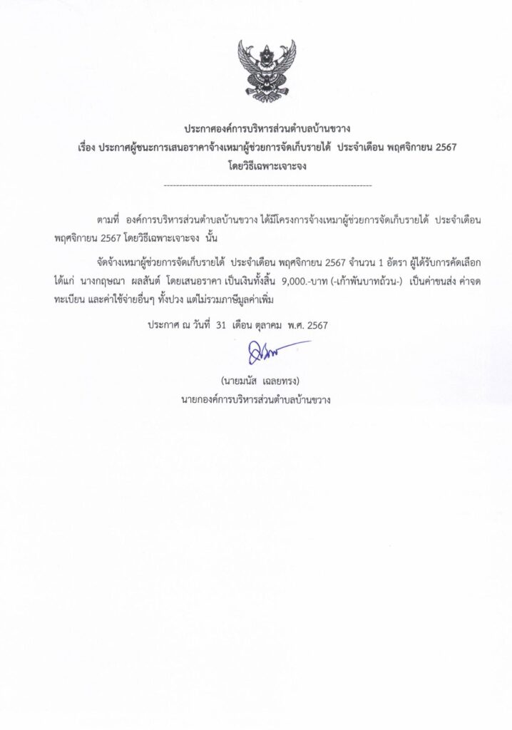 ประกาศองค์การบริหารส่วนตำบลบ้านขวาง เรื่อง ประกาศผู้ชนะการเสนอราคาจ้างเหมาผู้ช่วยการจัดเก็บรายได้ ประจำเดือน พฤศจิกายน 2567 โดยวิธีเฉพาะเจาะจง Post published:31 ตุลาคม 2024 Post category:ข่าวจัดซื้อจัดจ้าง