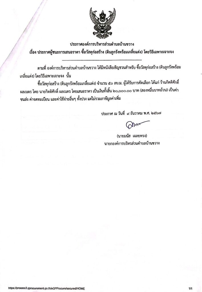 ประกาศองค์การบริหารส่วนตำบลบ้านขวาง เรื่อง ประกาศผู้ชนะการเสนอราคา ซื้อวัสดุก่อสร้าง (ดินลูกรังพร้อมเกลี่ยแต่ง) โดยวิธีเฉพาะเจาะจง