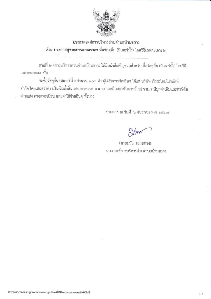 ประกาศองค์การบริหารส่วนตำบลบ้านขวาง เรื่อง ประกาศผู้ชนะการเสนอราคา ซื้อวัสดุอื่น (มิเตอร์น้ำ) โดยวิธีเฉพาะเจาะจง Post published:6 ธันวาคม 2024 Post category:ข่าวจัดซื้อจัดจ้าง