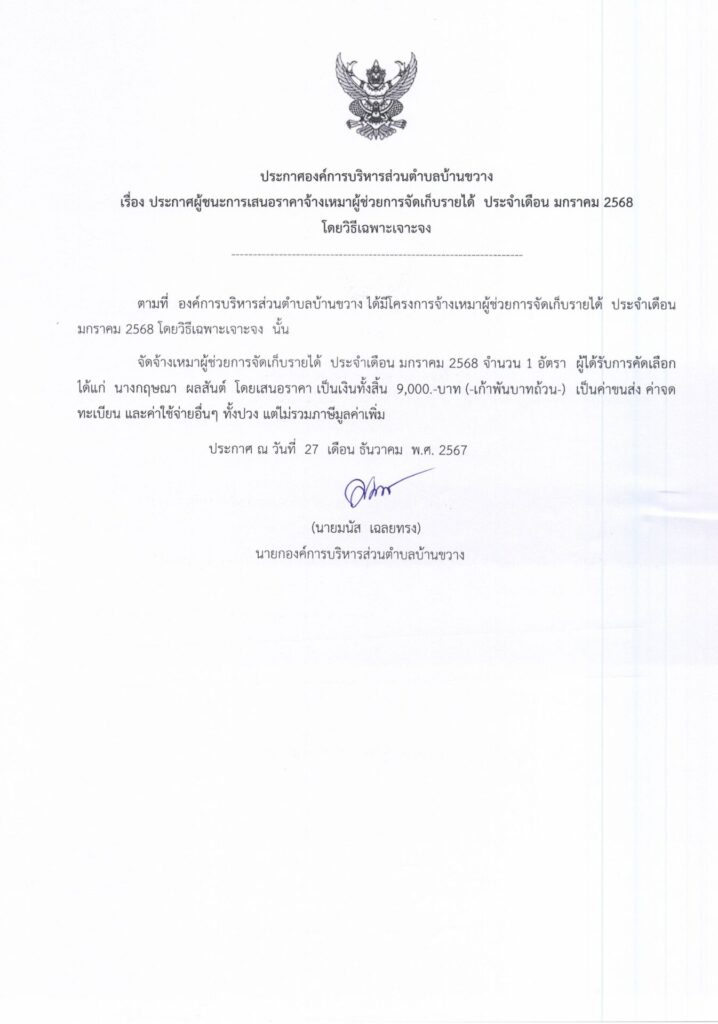 ประกาศองค์การบริหารส่วนตำบลบ้านขวาง เรื่อง ประกาศผู้ชนะการเสนอราคาจ้างเหมาผู้ช่วยการจัดเก็บรายได้ ประจำเดือน มกราคม  2568  โดยวิธีเฉพาะเจาะจง