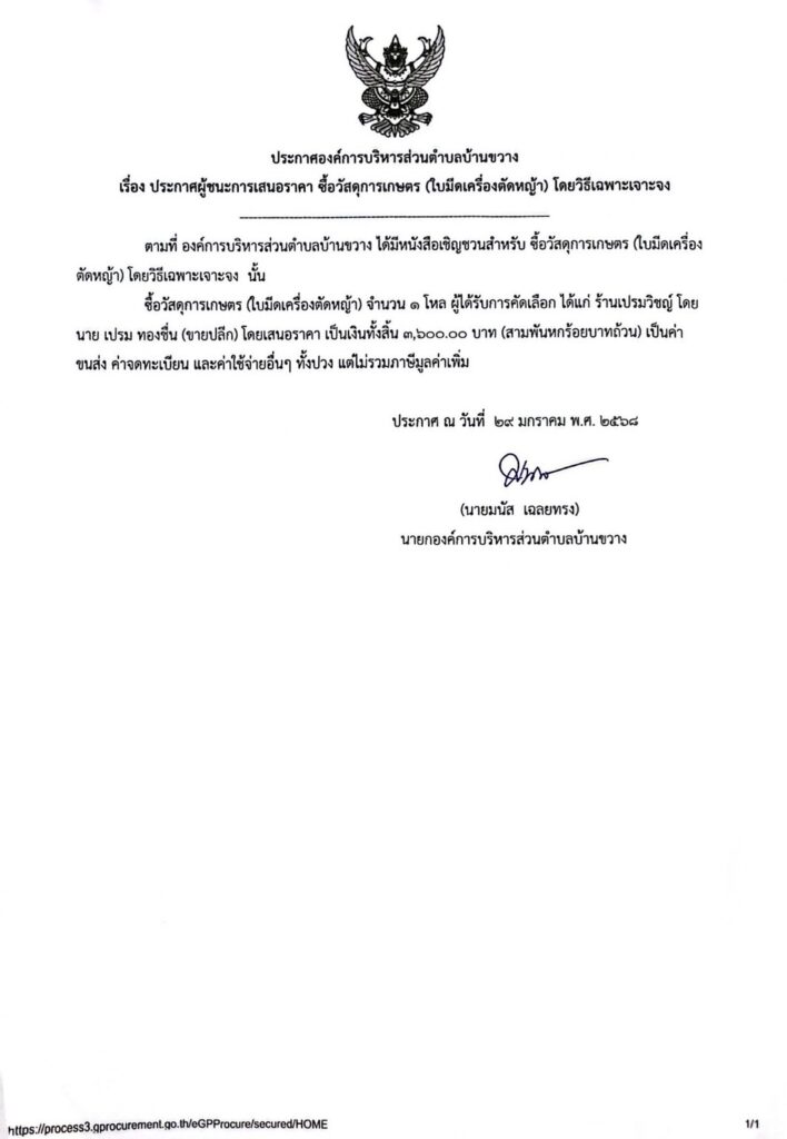 ประกาศองค์การบริหารส่วนตำบลบ้านขวาง เรื่อง ประกาศผู้ชนะการเสนอราคา ซื้อวัสดุการเกษตร (ใบมีดเครื่องตัดหญ้า) โดยวิธีเฉพาะเจาะจง Post published:29 มกราคม 2025 Post category:ข่าวจัดซื้อจัดจ้าง