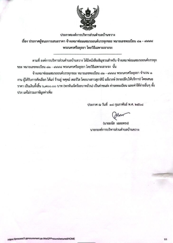 ประกาศองค์การบริหารส่วนตำบลบ้านขวาง เรื่อง ประกาศผู้ชนะการเสนอราคา จ้างเหมาซ่อมเเซมรถยนต์บรรทุกขยะ หมายเลขทะเบียน ๘๑ – ๙๙๙๘ พระนครศรีอยุธยา Post published:18 กุมภาพันธ์ 2025 Post category:ข่าวจัดซื้อจัดจ้าง