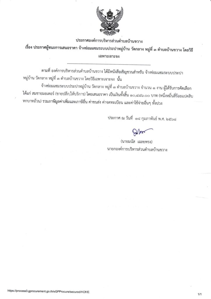 ประกาศองค์การบริหารส่วนตำบลบ้านขวาง เรื่อง ประกาศผู้ชนะการเสนอราคา จ้างซ่อมแซมระบบประปาหมู่บ้าน วัดกลาง หมู่ที่ ๓ ตำบลบ้านขวาง โดยวิธีเฉพาะเจาะจง Post published:18 กุมภาพันธ์ 2025 Post category:ข่าวจัดซื้อจัดจ้าง