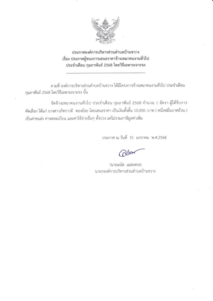 ประกาศองค์การบริหารส่วนตำบลบ้านขวาง เรื่อง ประกาศผู้ชนะการเสนอราคาจ้างเหมาคนงานทั่วไป ประจำเดือน กุมภาพันธ์ ๒๕๖๘ โดยวิธีเฉพาะเจาะจง Post published:31 มกราคม 2025 Post category:ข่าวจัดซื้อจัดจ้าง