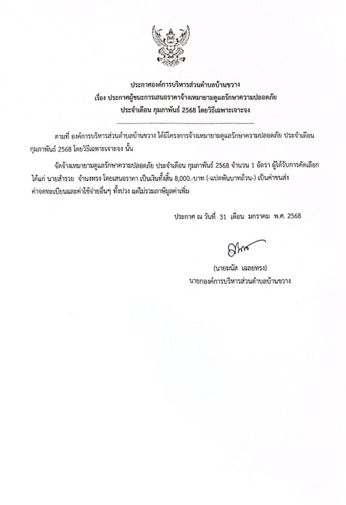 ประกาศองค์การบริหารส่วนตำบลบ้านขวาง เรื่อง ประกาศผู้ชนะการเสนอราคาจ้างเหมายามดูแลรักษาความปลอดภัย ประจำดือน กุมภาพันธ์ 2568 โดยวิธีเฉพาะเจาะจง Post published:31 มกราคม 2025 Post category:ข่าวจัดซื้อจัดจ้าง