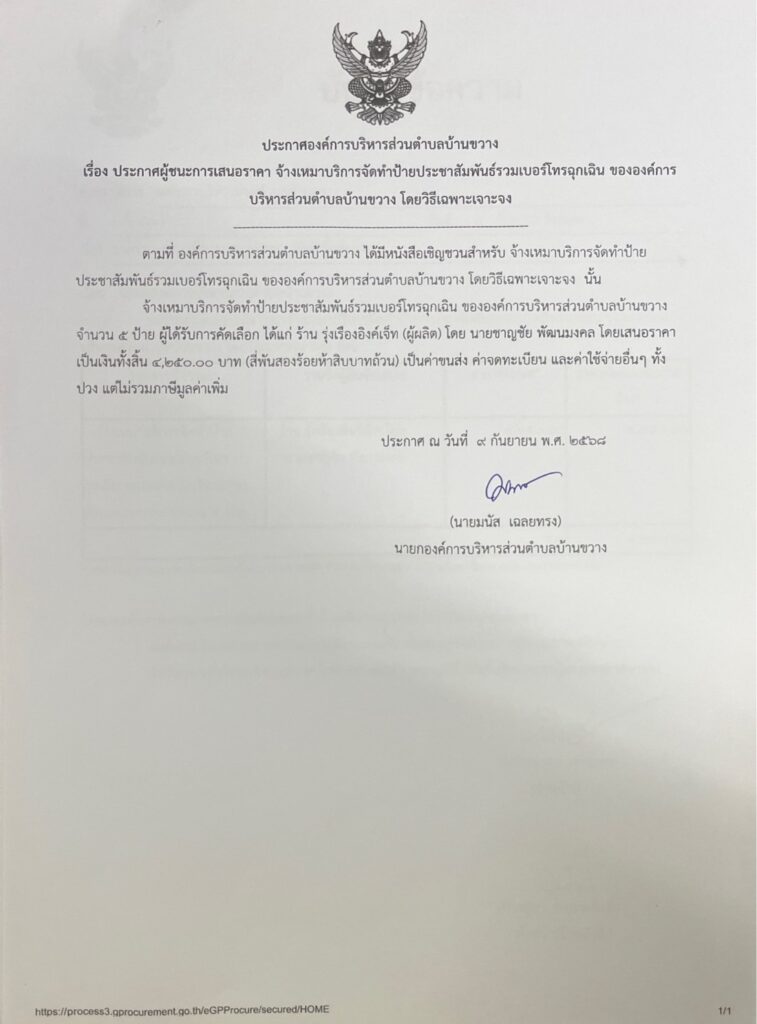 ประกาศองค์การบริหารส่วนตำบลบ้านขวาง เรื่อง ประกาศผู้ชนะการเสนอราคา จ้างเหมาบริการจัดทำป้ายประชาสัมพันธ์รวมเบอร์โทรฉุกเฉิน ขององค์การบริหารส่วนตำบลบ้านขวาง โดยวิธีเฉพาะเจาะจง Post published:9 กันยายน 2025 Post category:ไม่มีหมวดหมู่