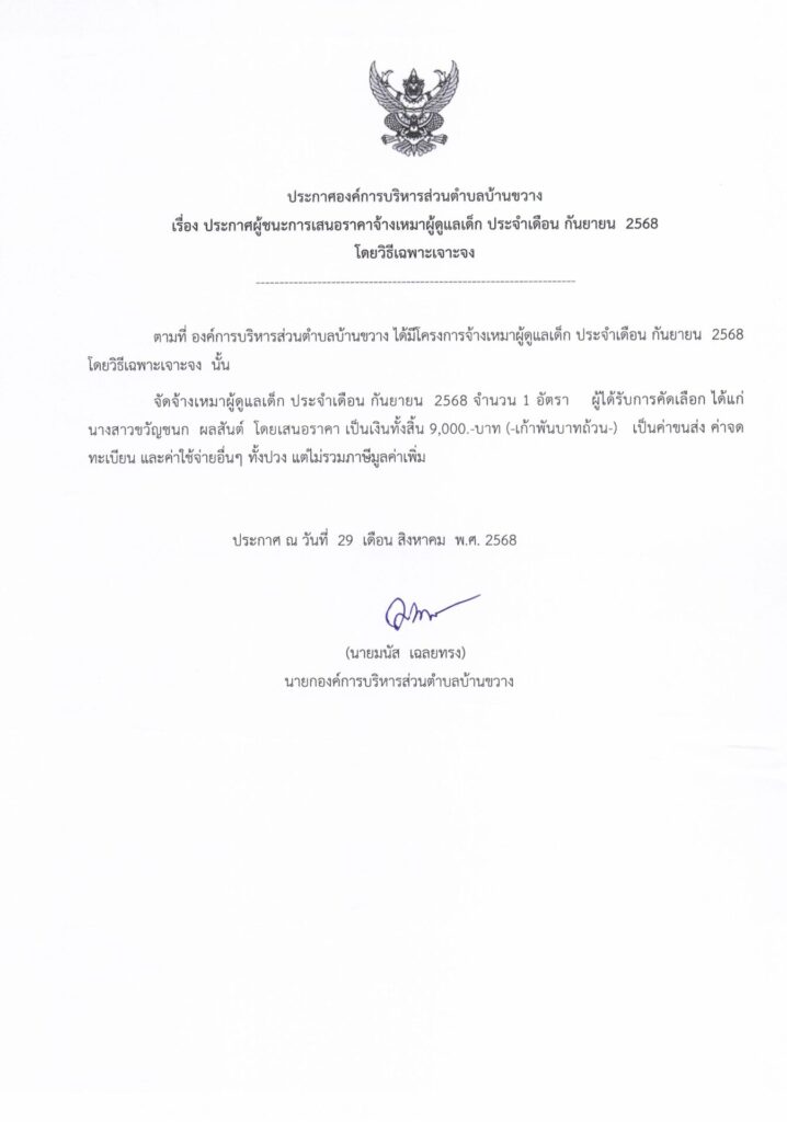 ประกาศองค์การบริหารส่วนตำบลบ้านขวาง เรื่อง ประกาศผู้ชนะการเสนอราคาจ้างเหมาผู้ดูแลเด็ก ประจำเดือน กันยายน 2568 โดยวิธีเฉพาะเจาะจง Post published:29 สิงหาคม 2025 Post category:ข่าวจัดซื้อจัดจ้าง