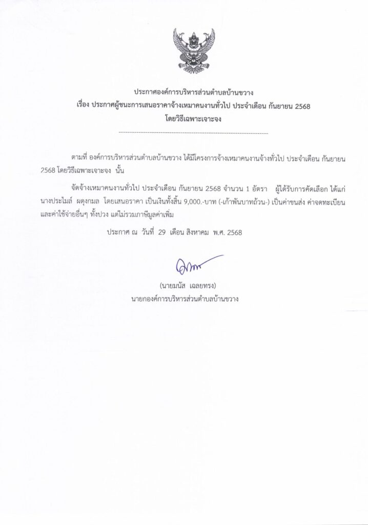 ประกาศองค์การบริหารส่วนตำบลบ้านขวาง เรื่อง ประกาศผู้ชนะการเสนอราคาจ้างเหมาคนงานทั่วไป ประจำเดือน กันยายน 2568 โดยวิธีเฉพาะเจาะจง Post published:29 สิงหาคม 2025 Post category:ข่าวจัดซื้อจัดจ้าง