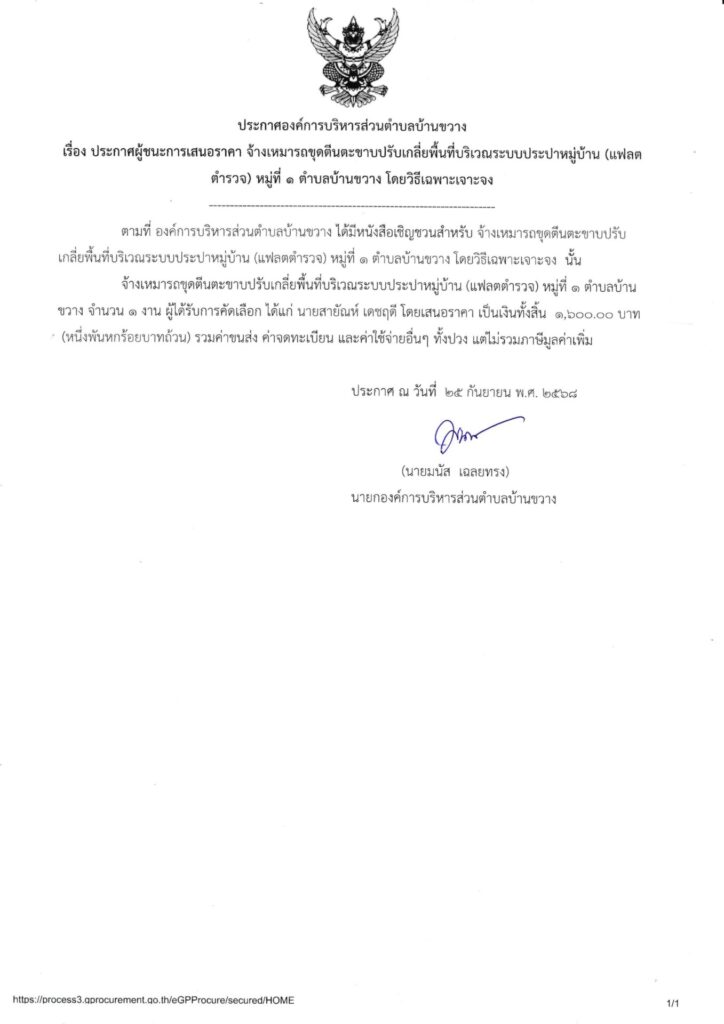 ประกาศองค์การบริหารส่วนตำบลบ้านขวาง เรื่อง ประกาศผู้ชนะการเสนอราคา จ้างเหมารถขุดตีนตะขาบปรับเกลี่ยพื้นที่บริเวณระบบประปาหมู่บ้าน (แฟลตตำรวจ) หมู่ที่ ๑ ตำบลบ้านขวาง โดยวิธีเฉพาะเจาะจง