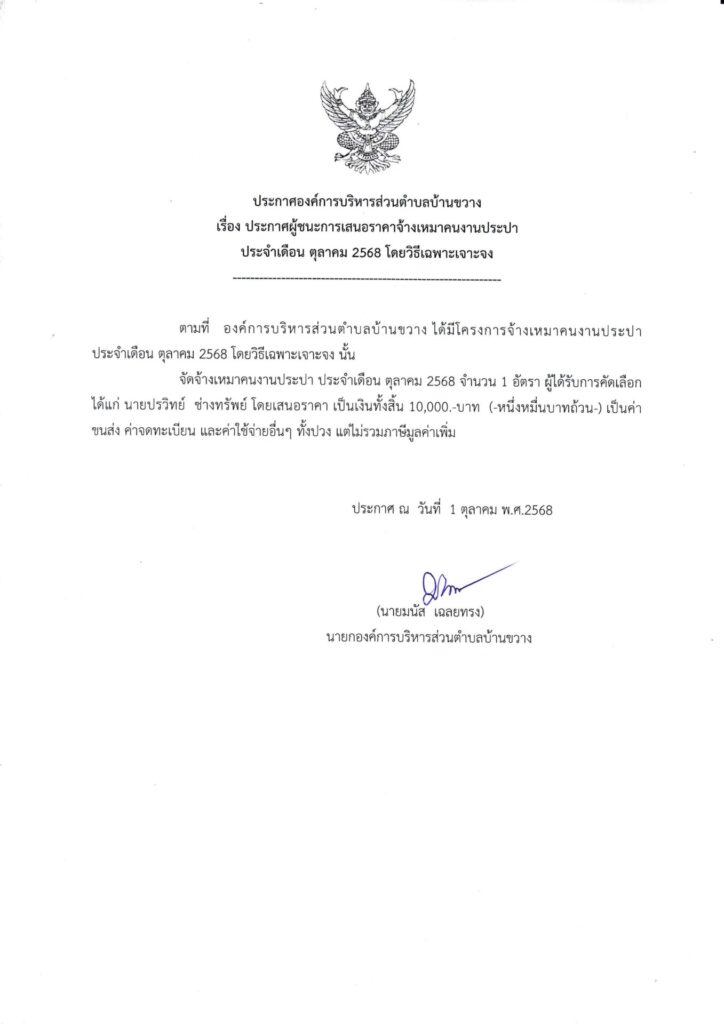 ประกาศองค์การบริหารส่วนตำบลบ้านขวาง เรื่อง ประกาศผู้ชนะการเสนอราคาจ้างเหมาคนงานประปา ประจำเดือน ตุลาคม ๒๕๖๘ โดยวิธีเฉพาะเจาะจง