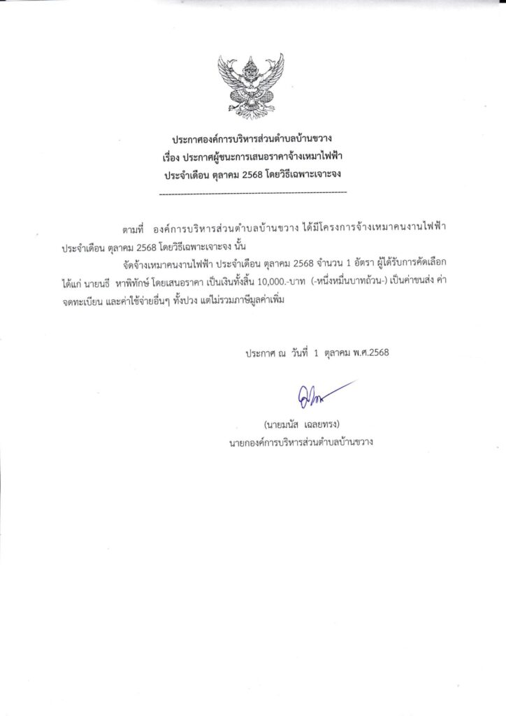 ประกาศองค์การบริหารส่วนตำบลบ้านขวาง เรื่อง ประกาศผู้ชนะการเสนอราคาจ้างเหมาคนงานไฟฟ้า ประจำเดือน ตุลาคม ๒๕๖๘ โดยวิธีเฉพาะเจาะจง Post published:1 ตุลาคม 2025 Post category:ข่าวจัดซื้อจัดจ้าง