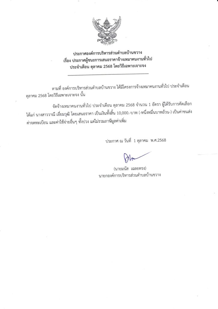 ประกาศองค์การบริหารส่วนตำบลบ้านขวาง เรื่อง ประกาศผู้ชนะการเสนอราคาจ้างเหมาคนงานทั่วไป ประจำเดือน ตุลาคม ๒๕๖๘ โดยวิธีเฉพาะเจาะจง
