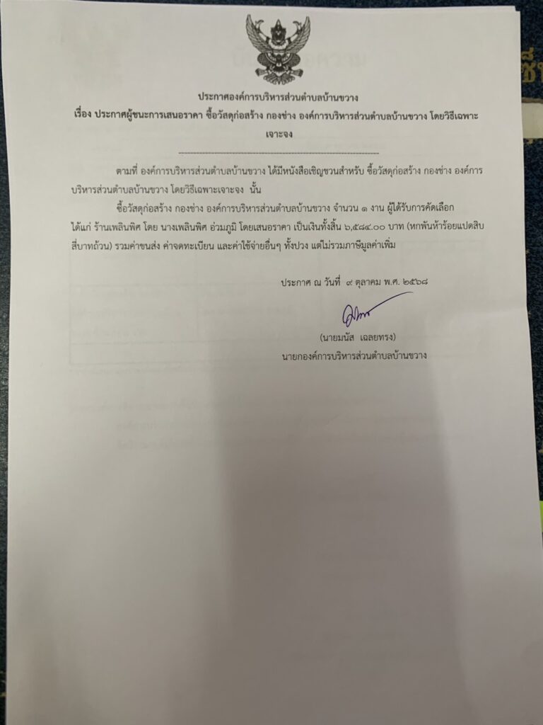 ประกาศองค์การบริหารส่วนตำบลบ้านขวาง เรื่อง ประกาศผู้ชนะการเสนอราคา ซื้อวัสดุก่อสร้าง กองช่อง องค์การบริหารส่วนตำบลบ้านขวาง โดยวิธีเฉพาะเจาะจง Post published:9 ตุลาคม 2025 Post category:ไม่มีหมวดหมู่