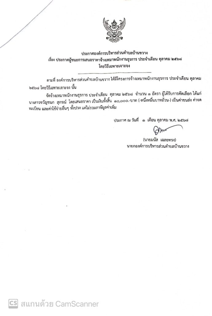 ประกาศองค์การบริหารส่วนตำบลบ้านขวางเรื่อง ประกาศผู้ชนะการเสนอราคาจ้างเหมาพนักงานธุรการ ประจำเดือน ตุลาคม ๒๕๖๘ โดยวิธีเฉพาะเจาะจง Post published:1 ตุลาคม 2025 Post category:ข่าวจัดซื้อจัดจ้าง