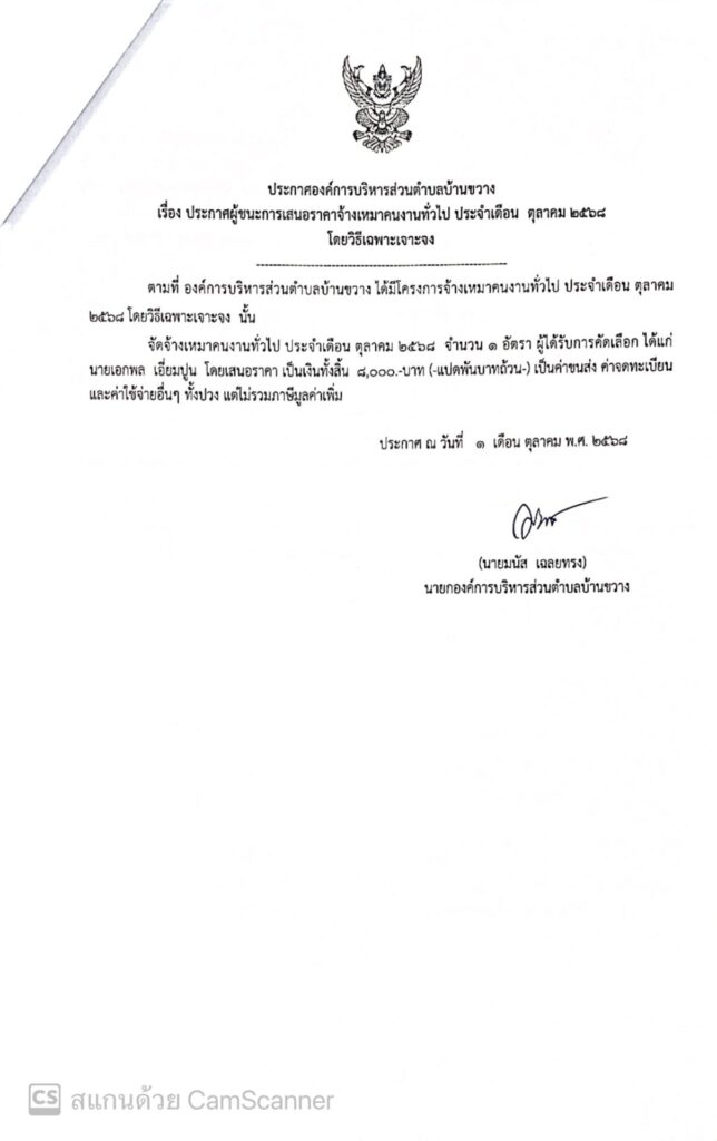 ประกาศองค์การบริหารส่วนตำบลบ้านขวางเรื่อง ประกาศผู้ชนะการเสนอราคาจ้างเหมาคนงานทั่วไป ประจำเดือน ตุลาคม ๒๕๖๘ โดยวิธีเฉพาะเจาะจง