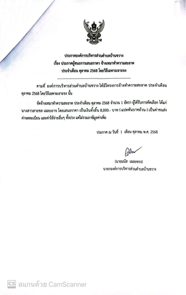 ประกาศองค์การบริหารส่วนตำบลบ้านขวาง เรื่อง ประกาศผู้ชนะการเสนอราคา จ้างเหมาทำความสะอาด ประจำเดือน ตุลาคม 2568 โดยวิธีเฉพาะเจาะจง