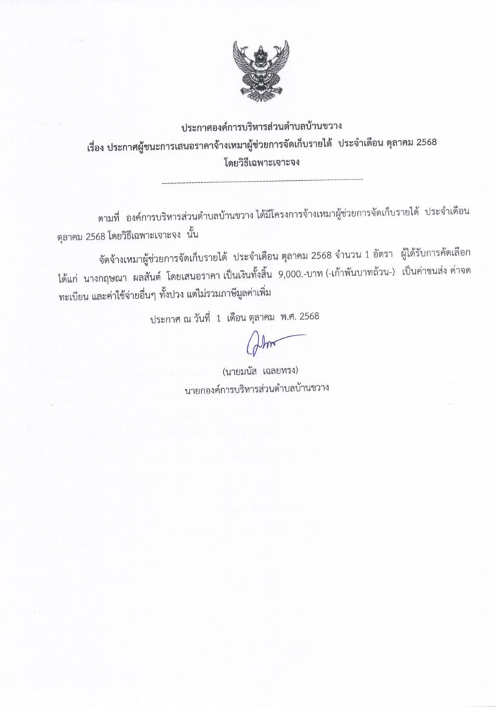 ประกาศองค์การบริหารส่วนตำบลบ้านขวาง เรื่อง ประกาศผู้ชนะการเสนอราคาจ้างเหมาผู้ช่วยการจัดเก็บรายได้ ประจำเดือน ตุลาคม  2568  โดยวิธีเฉพาะเจาะจง