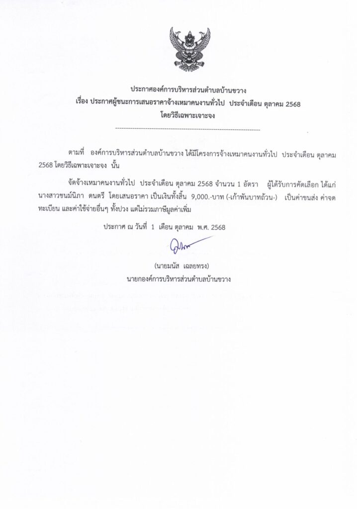 ประกาศองค์การบริหารส่วนตำบลบ้านขวาง เรื่อง ประกาศผู้ชนะการเสนอราคาจ้างเหมาคนงานทั่วไป ประจำเดือน ตุลาคม 2568 โดยวิธีเฉพาะเจาะจง Post published:1 ตุลาคม 2025 Post category:ข่าวจัดซื้อจัดจ้าง