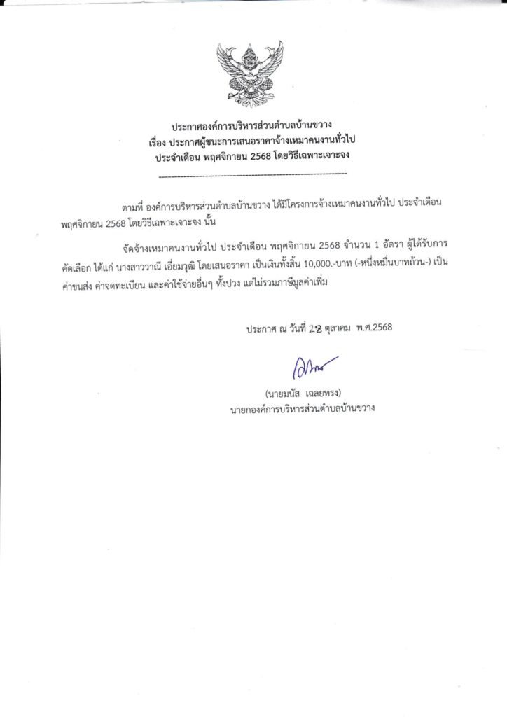 ประกาศองค์การบริหารส่วนตำบลบ้านขวาง เรื่อง ประกาศผู้ชนะการเสนอราคาจ้างเหมาคนงานทั่วไป ประจำเดือน พฤศจิกายน ๒๕๖๘ โดยวิธีเฉพาะเจาะจง