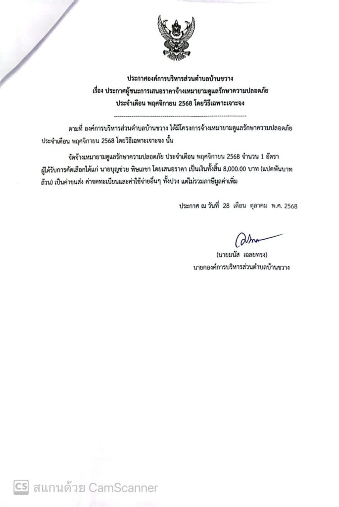 ประกาศองค์การบริหารส่วนตำบลบ้านขวาง เรื่อง ประกาศผู้ชนะการเสนอราคา จ้างเหมายามดูแลรักษาความปลอดภัย ประจำเดือน พฤศจิกายน 2568 โดยวิธีเฉพาะเจาะจง