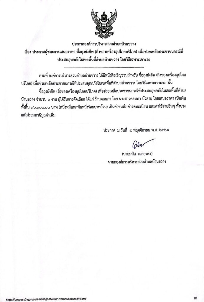 ประกาศองค์การบริหารส่วนตำบลบ้านขวาง เรื่อง ประกาศผู้ชนะการเสนอราคา ซื้อถุงยังชีพ (สิ่งของเครื่องอุปโภคบริโภค) เพื่อช่วยเหลือประชาชนกรณีที่ประสบอุทกภัยในเขตพื้นที่ตำบลบ้านขวาง โดยวิธีเฉพาะเจาะจง Post published:5 พฤศจิกายน 2025 Post category:ข่าวจัดซื้อจัดจ้าง