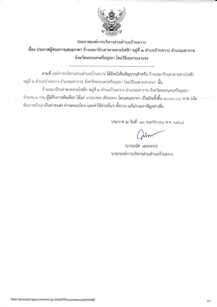 ประกาศองค์การบริหารส่วนตำบลบ้านขวาง เรื่อง ประกาศผู้ชนะการเสนอราคา จ้างเหมาปักเสาพาดสายไฟฟ้า หมู่ที่ ๒ ตำบลบ้านขวาง อำเภอมหาราช จังหวัดพระนครศรีอยุธยา โดยวิธีเฉพาะเจาะจง Post published:12 พฤศจิกายน 2025 Post category:ข่าวจัดซื้อจัดจ้าง