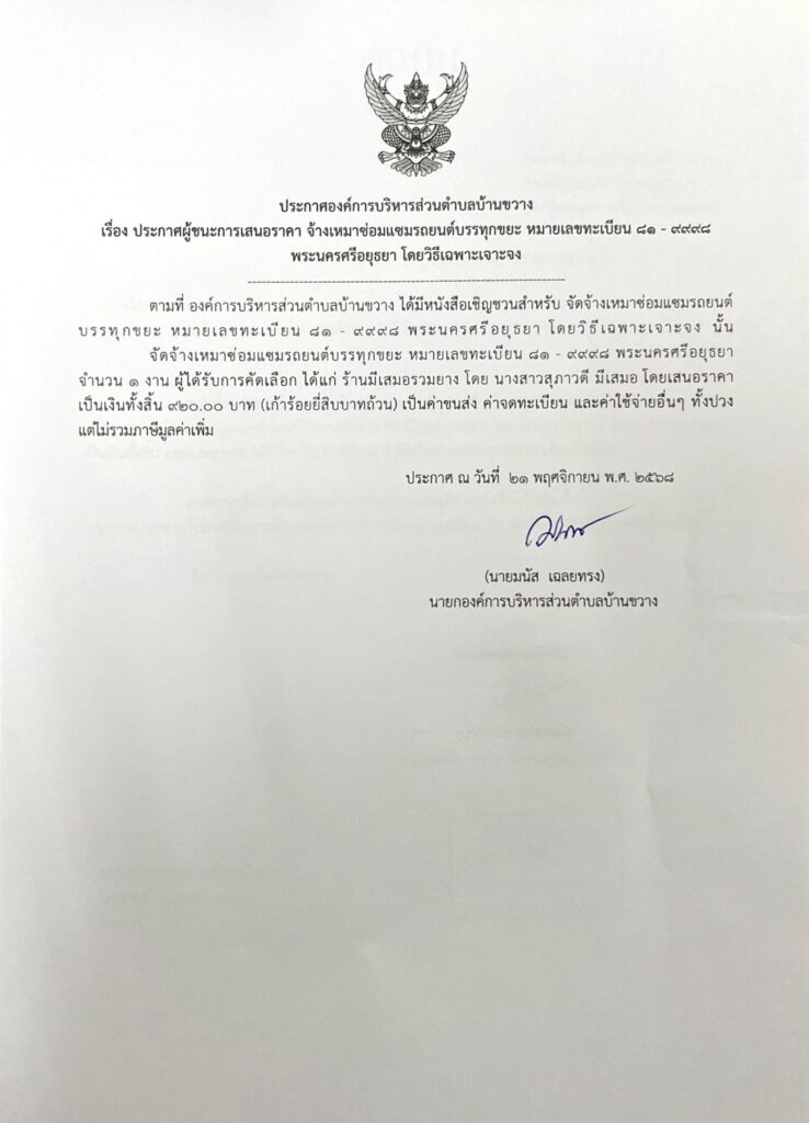 ประกาศองค์การบริหารส่วนตำบลบ้านขวาง เรื่อง ประกาศผู้ชนะการเสนอราคา จ้างเหมาซ่อมเเซมรถยนต์บรรทุกขยะ หมายเลขทะเบียน 81 – 9998 พระนครศรีอยุธยา โดยวิธีเฉพาะเจาะจง Post published:21 พฤศจิกายน 2025 Post category:ข่าวจัดซื้อจัดจ้าง