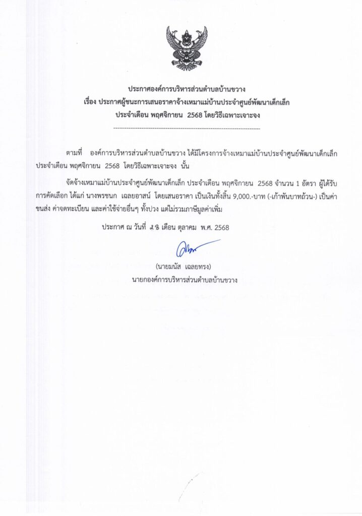 ประกาศองค์การบริหารส่วนตำบลบ้านขวาง เรื่อง ประกาศผู้ชนะการเสนอราคาจ้างเหมาแม่บ้านประจำศูนย์พัฒนาเด็กเล็ก ประจำเดือน พฤศจิกายน 2568 โดยวิธีเฉพาะเจาะจง Post published:28 ตุลาคม 2025 Post category:ข่าวจัดซื้อจัดจ้าง