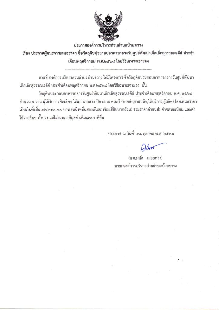 ประกาศองค์การบริหารส่วนตำบลบ้านขวาง เรื่อง ประกาศผู้ชนะการเสนอราคา ซื้อวัตถุดิบประกอบอาหารกลางวันศูนย์พัฒนาเด็กเล็กสุวรรณเจดีย์ ประจำเดือนพฤศจิกายน พ.ศ. 2568 โดยวิธีเฉพาะเจาะจง Post published:31 ตุลาคม 2025 Post category:ข่าวจัดซื้อจัดจ้าง