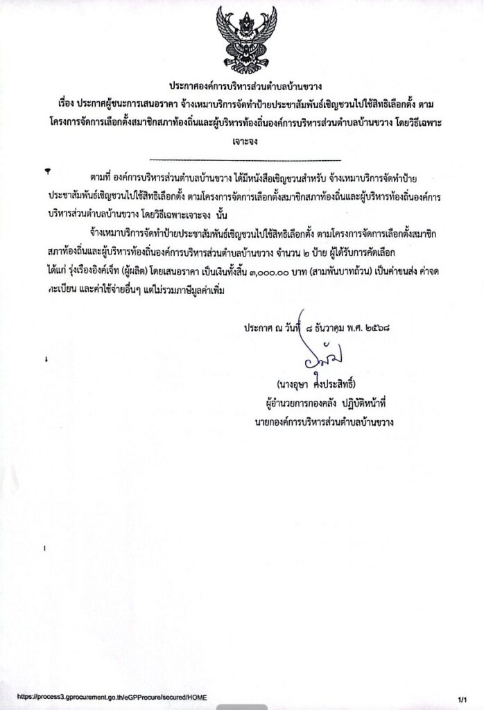 ประกาศองค์การบริหารส่วนตำบลบ้านขวาง เรื่อง ประกาศผู้ชนะการเสนอราคา จ้างเหมาบริการจัดทำป้ายประชาสัมพันธ์เชิญชวนไปใช้สิทธิเลือกตั้ง ตามโครงการจัดการเลือกสมาชิกสภาท้องถิ่นและผู้บริหารท้องถิ่นองค์การบริหารส่วนตำบลบ้านขวาง โดยวิธีเฉพาะเจาะจง Post published:8 ธันวาคม 2025 Post category:ข่าวจัดซื้อจัดจ้าง
