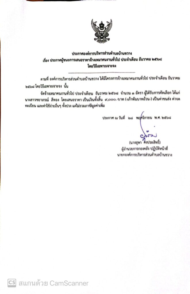 ประกาศองค์การบริหารส่วนตำบลบ้านขวาง เรื่อง ประกาศผู้ชนะการเสนอราคาจ้างเหมาคนงานทั่วไป ประจำเดือน ธันวาคม 2568 โดยวิธีเฉพาะเจาะจง
