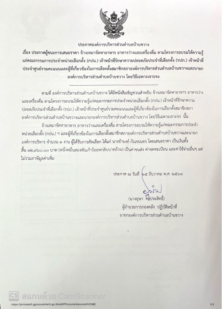ประกาศองค์การบริหารส่วนตำบลบ้านขวาง เรื่อง ประกาศผู้ชนะการเสนอราคา จ้างเหมาจัดหาอาหารและเครื่องดื่ม ตามโครงการฝึกอบรมคณะกรรมการประจำหน่วยเลือกตั้ง (กปน.) เจ้าหน้าที่รักษาความปลอดภัยประจำที่เลือกตั้ง (รปภ.) เจ้าหน้าที่ประจำศูนย์รวมคะแนนและผู้ที่เกี่ยวข้องในการเลือกตั้งนายกองค์การบริหารส่วนตำบลบ้านขวาง