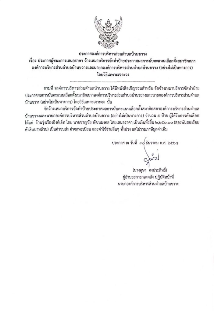 ประกาศองค์การบริหารส่วนตำบลบ้านขวาง เรื่อง ประกาศผู้ชนะการเสนอราคาจ้างเหมาบริการจัดทำป้ายประกาศผลการนับคะแนนเลือกตั้งสมาชิกสภาองค์การบริหารส่วนตำบลบ้านขวางและนายกองค์การบริหารส่วนตำบลบ้านขวาง (อย่างไม่เป็นทางการ) โดยวิธีเฉพาะเจาะจง Post published:30 ธันวาคม 2025 Post category:ข่าวจัดซื้อจัดจ้าง