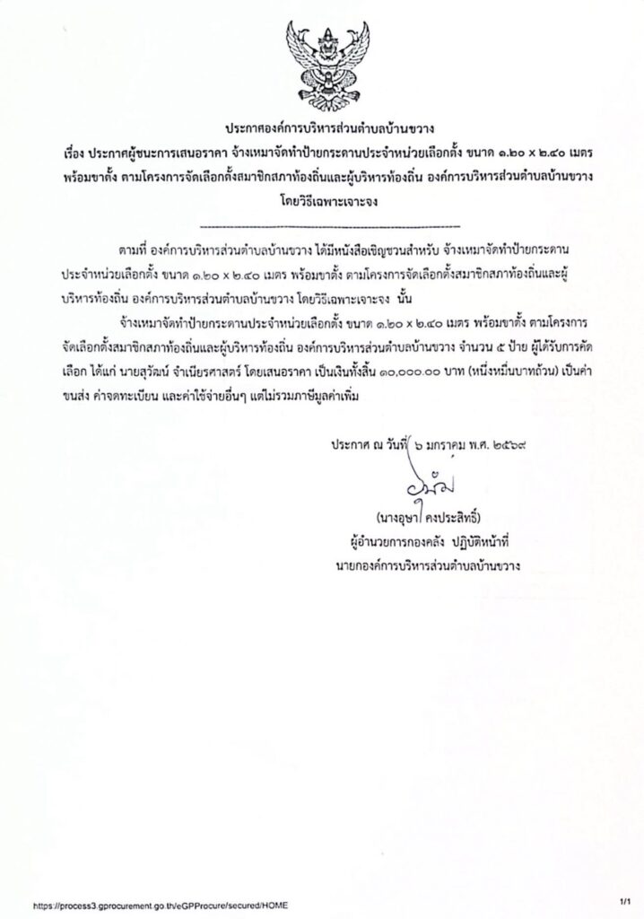 ประกาศองค์การบริหารส่วนตำบลบ้านขวาง เรื่อง ประกาศผู้ชนะการเสนอราคา จ้างเหมาจัดทำป้ายกระดานประจำหน่วยเลือกตั้ง ขนาด 1.20 * 2.40 เมตร พร้อมขาตั้ง ตามโครงการจัดการเลือกตั้งสมาชิกสภาท้องถิ่นและผู้บริหารท้องถิ่น องค์การบริหารส่วนตำบลบ้านขวาง โดยวิธีเฉพาะเจาะจง