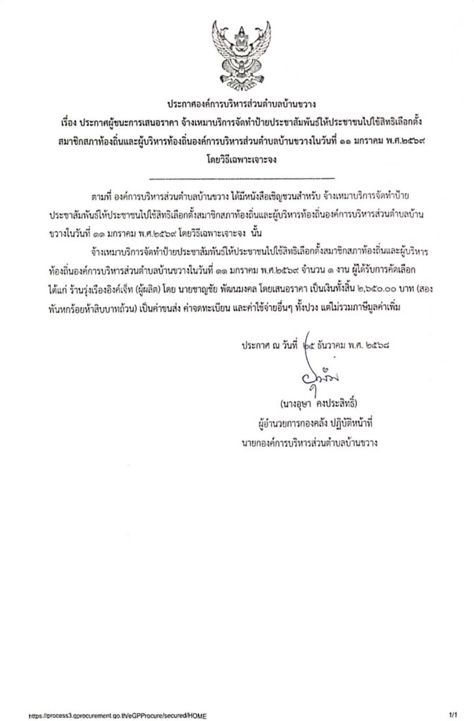 ประกาศองค์การบริหารส่วนตำบลบ้านขวาง เรื่อง ประกาศผู้ชนะการเสนอราคา จ้างเหมาจัดทำป้ายประชาสัมพันธ์ให้ประชาชนไปใช้สิทธิเลือกตั้ง สมาชิกสภาท้องถิ่นและผู้บริหารท้องถิ่นองค์การบริหารส่วนตำบลบ้านขวาง ในวันที่ 11 มกราคม พ.ศ.2569 โดยวิธีเฉพาะเจาะจง