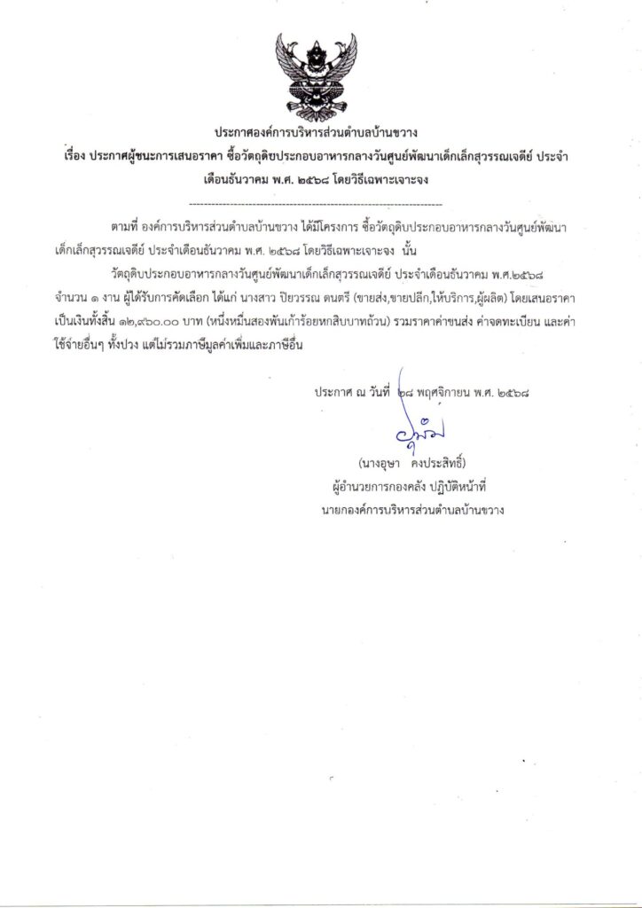 ประกาศองค์การบริหารส่วนตำบลบ้านขวาง เรื่อง ประกาศผู้ชนะการเสนอราคา ซื้อวัตถุดิบประกอบอาหารกลางวันศูนย์พัฒนาเด็กเล็กสุวรรณเจดีย์ ประจำเดือนธันวาคม พ.ศ. 2568 โดยวิธีเฉพาะเจาะจง