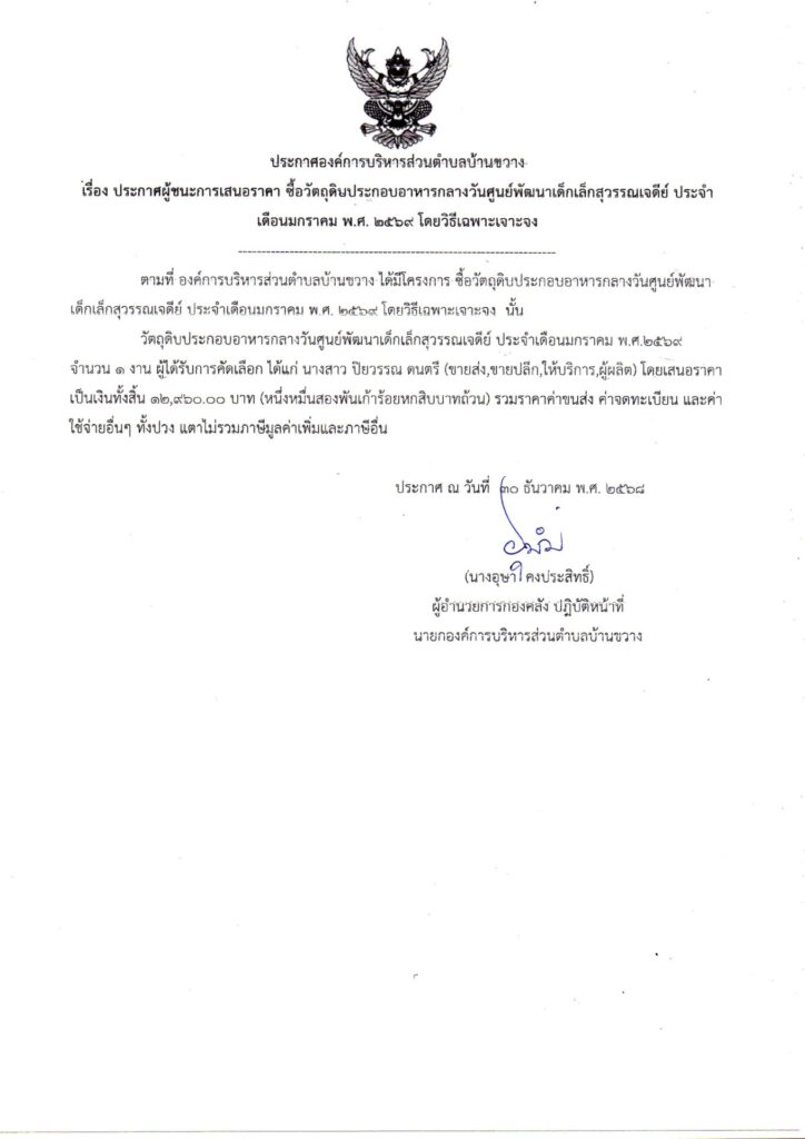 ประกาศองค์การบริหารส่วนตำบลบ้านขวาง เรื่อง ประกาศผู้ชนะการเสนอราคา ซื้อวัตถุดิบประกอบอาหารกลางวันศูนย์พัฒนาเด็กเล็กสุวรรณเจดีย์ ประจำเดือนมกราคม พ.ศ. 2569 โดยวิธีเฉพาะเจาะจง