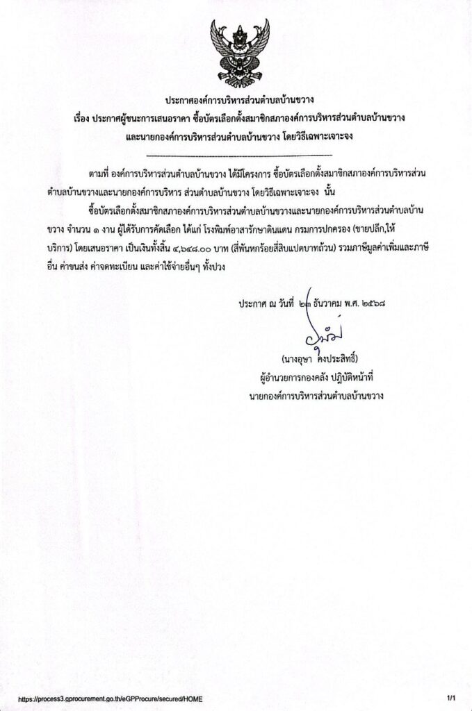 ประกาศองค์การบริหารส่วนตำบลบ้านขวาง เรื่อง ประกาศผู้ชนะการเสนอราคา ซื้อบัตรเลือกตั้งสมาชิกสภาองค์การบริหารส่วนตำบลบ้านขวางและนายกองค์การบริหารส่วนตำบลบ้านขวาง โดยวิธีเฉพาะเจาะจง