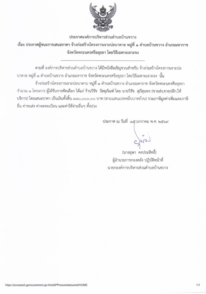 ประกาศองค์การบริหารส่วนตำบลบ้านขวาง เรื่อง ประกาศผู้ชนะการเสนอราคา จ้างก่อสร้างโครงการเจาะบ่อบาดาล หมู่ที่ ๑ ตำบลบ้านขวาง อำเภอมหาราช จังหวัดพระนครศรีอยุธยา โดยวิธีเฉพาะเจาะจง Post published:15 มกราคม 2026 Post category:ข่าวจัดซื้อจัดจ้าง