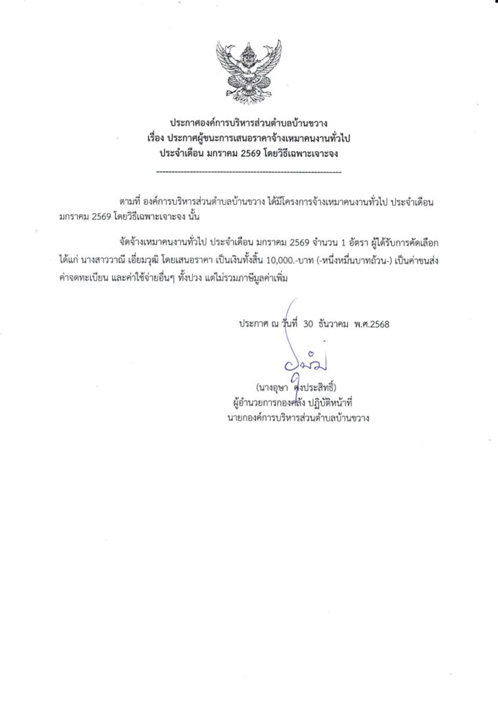 ประกาศองค์การบริหารส่วนตำบลบ้านขวาง เรื่อง ประกาศผู้ชนะการเสนอราคาจ้างเหมาคนงานทั่วไป ประจำเดือน มกราคม ๒๕๖๙ โดยวิธีเฉพาะเจาะจง Post published:30 ธันวาคม 2025 Post category:ข่าวจัดซื้อจัดจ้าง