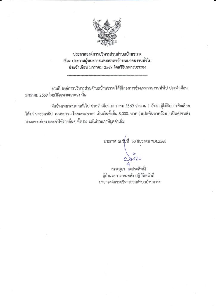 ประกาศองค์การบริหารส่วนตำบลบ้านขวาง เรื่อง ประกาศผู้ชนะการเสนอราคาจ้างเหมาคนงานทั่วไป ประจำเดือน มกราคม ๒๕๖๙ โดยวิธีเฉพาะเจาะจง