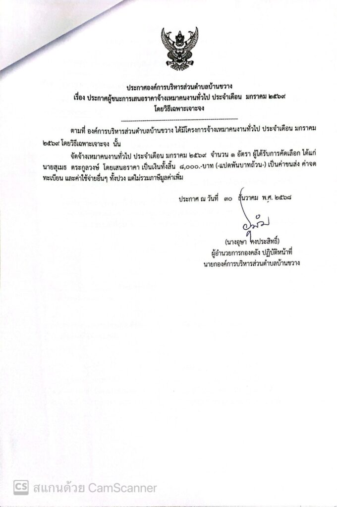 ประกาศองค์การบริหารส่วนตำบลบ้านขวาง เรื่อง ประกาศผู้ชนะการเสนอราคาจ้างเหมาคนงานทั่วไป ประจำเดือน มกราคม 2569 โดยวิธีเฉพาะเจาะจง