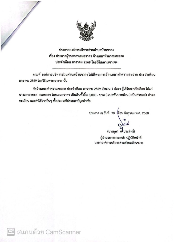 ประกาศองค์การบริหารส่วนตำบลบ้านขวาง เรื่อง ประกาศผู้ชนะการเสนอราคา จ้างเหมาทำความสะอาด ประจำเดือน มกราคม 2569 โดยวิธีเฉพาะเจาะจง